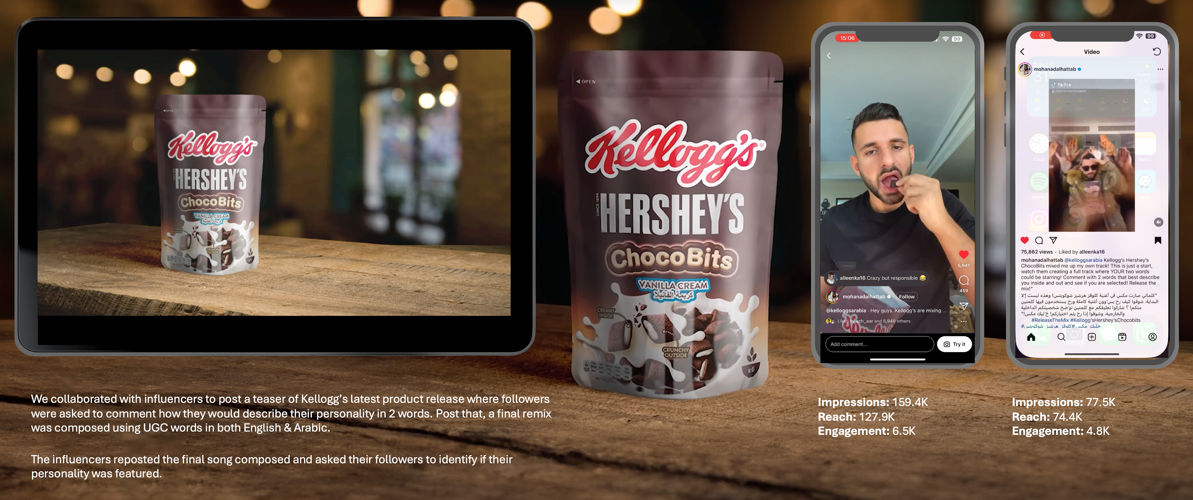 We added a musical touch to Kellogg's Hershey's ChocoBits influencer campaign. Influencers shared a sneak peek of Kellogg's latest release, prompting followers to describe their personality in just two words. These words were then used to create a unique remix in English and Arabic. Influencers shared the final song, inviting their followers to spot their personality traits within the harmonious blend.