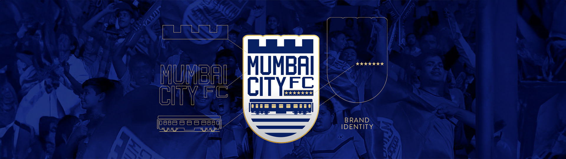 essence of the city itself. The fort symbolises defense, the local train embodies the midfield, and the 7 stars symbolise the city built on seven islands. The blue lines at the base symbolise the drive to achieve new milestones, all enclosed within a shield representing the collaborative teamwork.